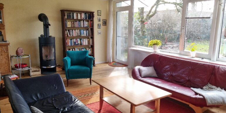 Der großzügige Wohnbereich verfügt über einen direkten Zugang zur Terrasse und in den Gartenbereich. Eine gemütliche Kaminecke unterstreicht den einladenden Charakter dieses Bereiches.