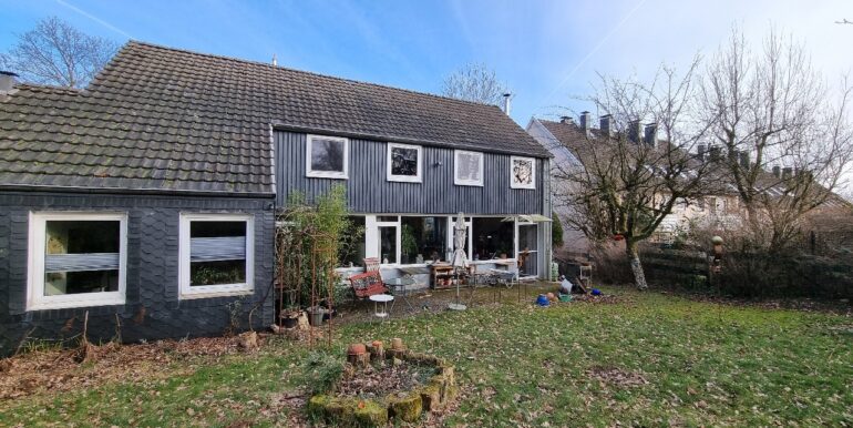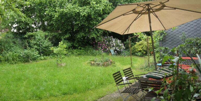 Garten mit einer Terrasse. Zusätzlich bietet das Obergeschoss einen kleinen Balkon, welcher sich an der südlichen Giebelseite der Immobilie befindet.