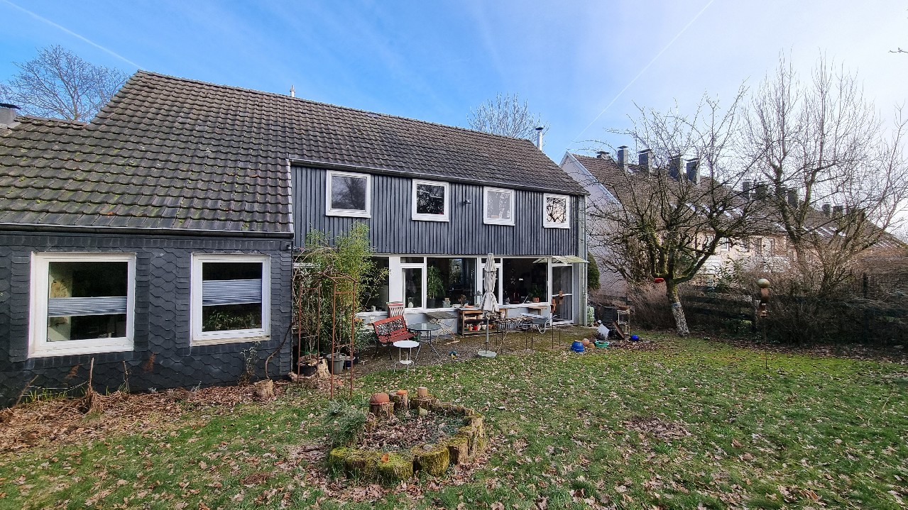Die Fassade des Hauses ist teilweise verputzt, mit Holz bekleidet und teilweise verschiefert.