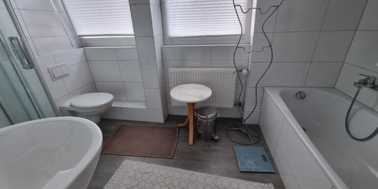 Das moderne und helle Tageslichtbad im Obergeschoss ist mit einem Waschtisch, einer Badewanne, einer Dusche, sowie einem WC ausgestattet.