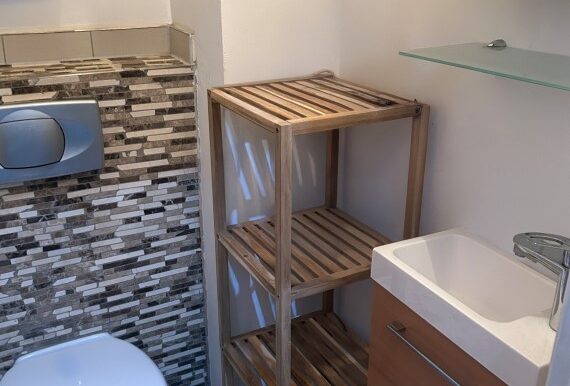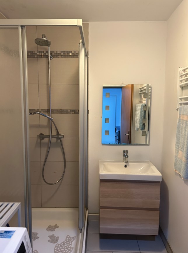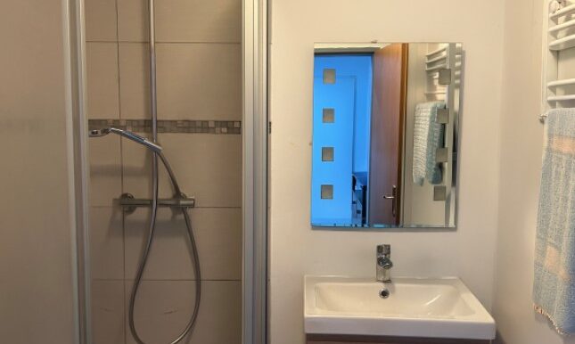 Das innenliegende Badezimmer verfügt über eine Eckdusche, einen Waschtisch sowie einen Anschluss für die Waschmaschine. Ergänzt wird das Raumangebot durch ein separa-tes WC, welches ebenfalls mit einem Waschtisch ausgestattet ist.