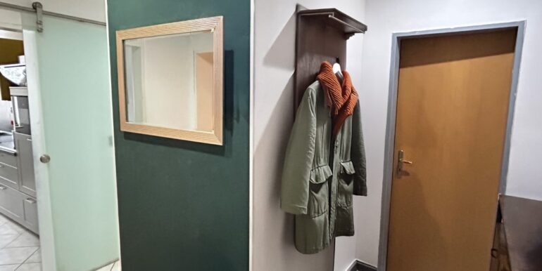 Die Diele ist u-förmig angelegt und erschließt auf der rechten Seite das Schlafzimmer sowie geradeaus das Badezimmer. Auf der gegenüberliegenden Seite das Wohnzimmer, die Küche und das Kinderzimmer, während sich das separate WC am Ende des Flurs befindet.