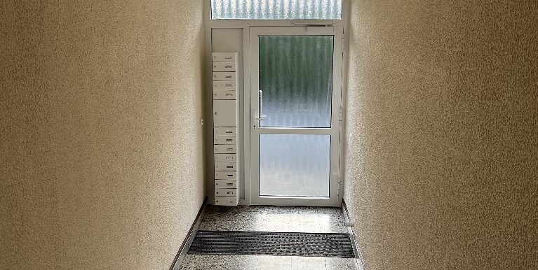 Das gepflegte und hell gestaltete Treppenhaus ist ebenfalls in massiver Bauweise ausgeführt. Die Wandflächen sind verputzt und gestrichen. Die Kunststeinbodenfliesen sind an eine Granitoptik angelehnt.