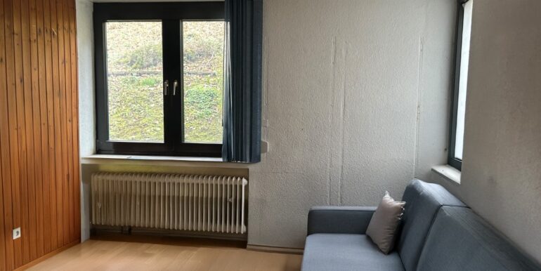Das Wohnzimmer bietet den Zugang zur Loggia und fungiert als zentraler Aufenthaltsbereich der Wohnung. Die Küche ist funktional offen zum Wohnbereich angeordnet.