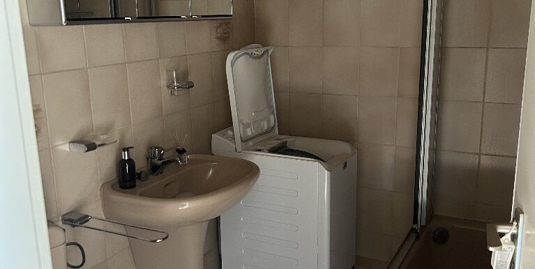 Ausgestattet ist das Badezimmer mit einer platzsparende Eck-Dusche, einem Waschtisch sowie einem Waschmaschinenanschluss und einem WC.