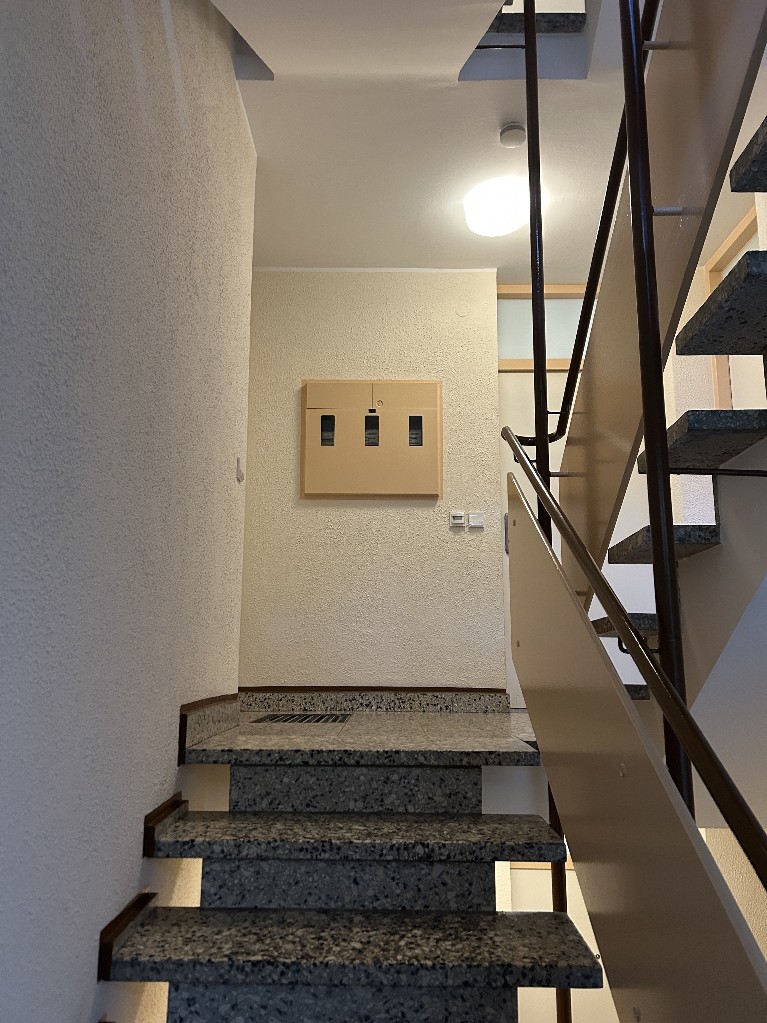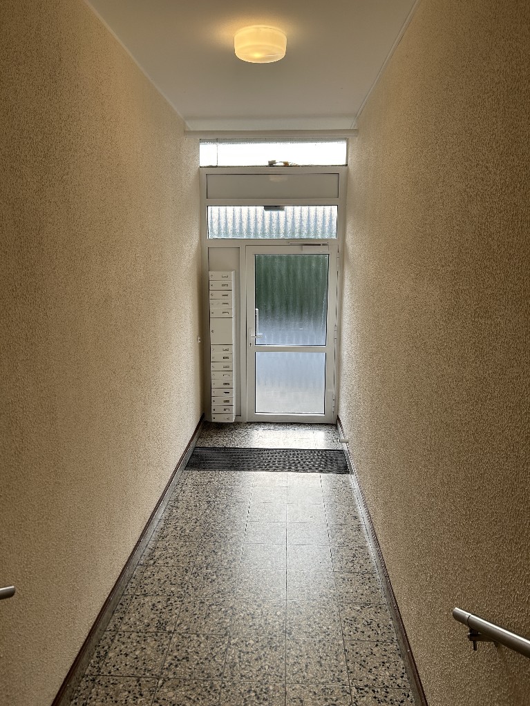 Das gepflegte und hell gestaltete Treppenhaus ist ebenfalls in massiver Bauweise ausgeführt. Die Wandflächen sind verputzt und gestrichen. Die Kunststeinbodenfliesen sind an eine Granitoptik angelehnt.
